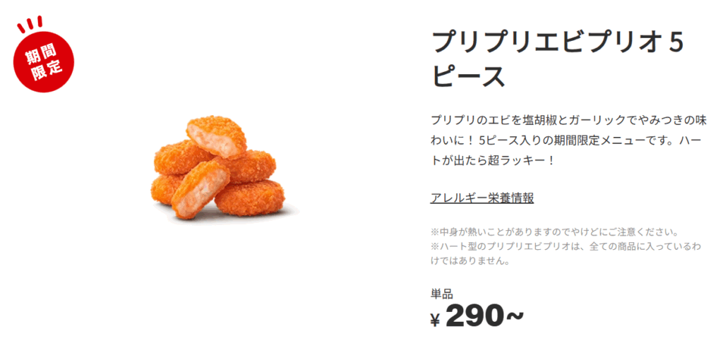 2025年09月22日 9/17(水)から期間限定で登場!やみつきなおいしさ!「プリプリエビプリオ」 ※表記は税込み価格です。※一部店舗ではお取り扱いのない場合がございます。※特定店舗では店舗の所在地域や立地条件により価格が異なります。特定店舗とは、特殊立地店舗、都心型店舗、準都心型店舗の総称です。該当店舗はこちら。※画像はイメージです。 お知らせ一覧