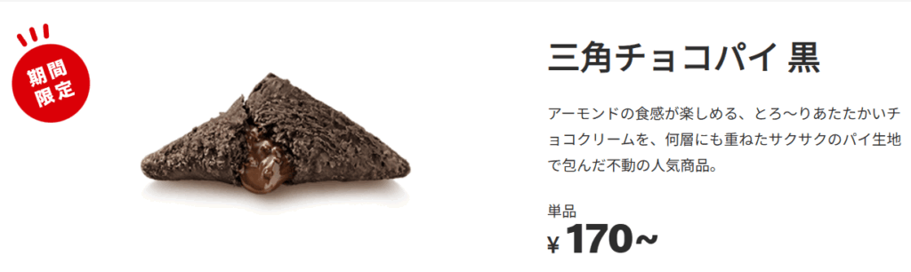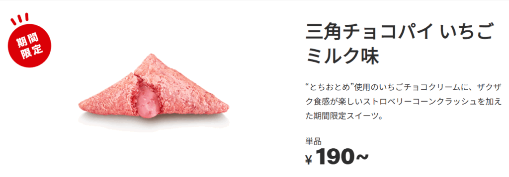 2025年10月02日 10/8(水)から期間限定で登場!秋冬の定番「三角チョコパイ 黒」新作「三角チョコパイ いちごミルク味」も! ※中身が熱いことがありますのでやけどにご注意ください。※表記は税込み価格です。※一部店舗でお取り扱いのない商品がございます。※特定店舗では店舗の所在地域や立地条件により価格が異なります。特定店舗とは、特殊立地店舗、都心型店舗、準都心型店舗の総称です。該当店舗はこちら。※画像はイメージです。 お知らせ一覧