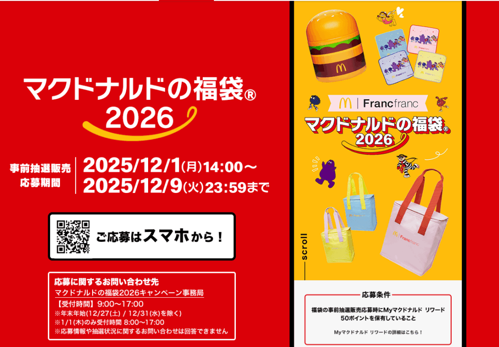 2025年12月02日 12/1(月)~12/9(火)23:59まで 2026年マクドナルドの福袋 抽選です。ご確認は、アプリ または こちらから マクドナルドの福袋®2026 | マクドナルド公式 お知らせ一覧