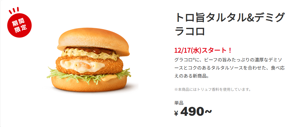 2025年12月11日 12/17(水)から期間限定で登場!冬の風物詩『グラコロ®』シリーズ トロ旨タルタル&デミグラスがスタート ※表記は税込み価格です。※一部店舗でお取り扱いのない商品がございます。※画像はイメージです。 お知らせ一覧