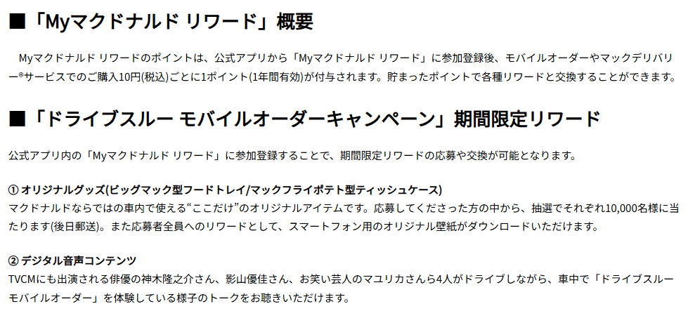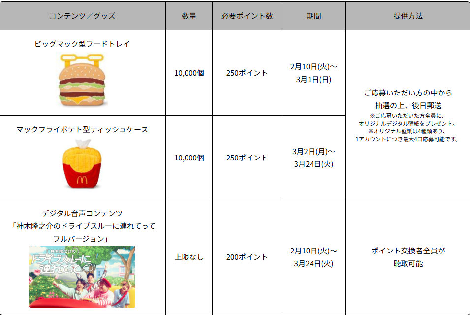 「ドライブスルー モバイルオーダーキャンペーン」2月から期間限定でスタートMyマクドナルド リワードポイントで「ビッグマック型フードトレイ」など車内で楽しめるオリジナルグッズが抽選で当たる!